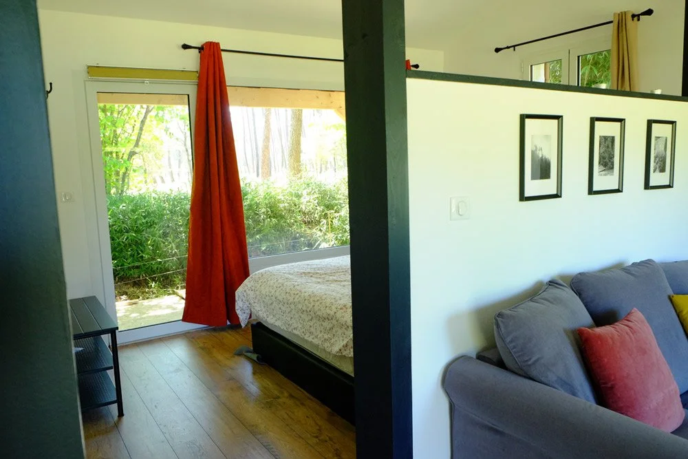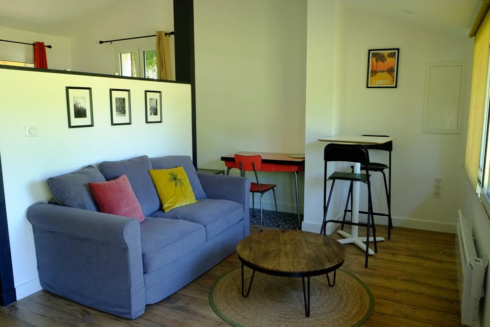 Ce logement pour 2 personnes propose une cuisine équipée, un coin salon, une salle de bain et la chambre ouverte sur la forêt des Landes