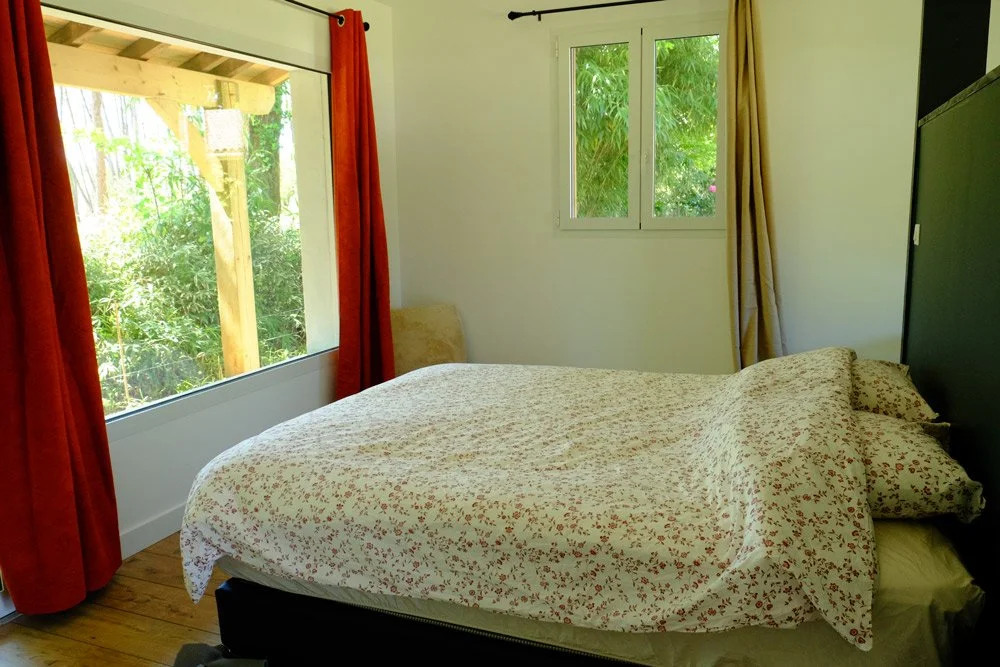 Une grande chambre pouvant accueillir 3 personnes dans un lit double et un lit simple sur demande. Salle de bain donnant sur la forêt tout comme sa terrasse individuelle.